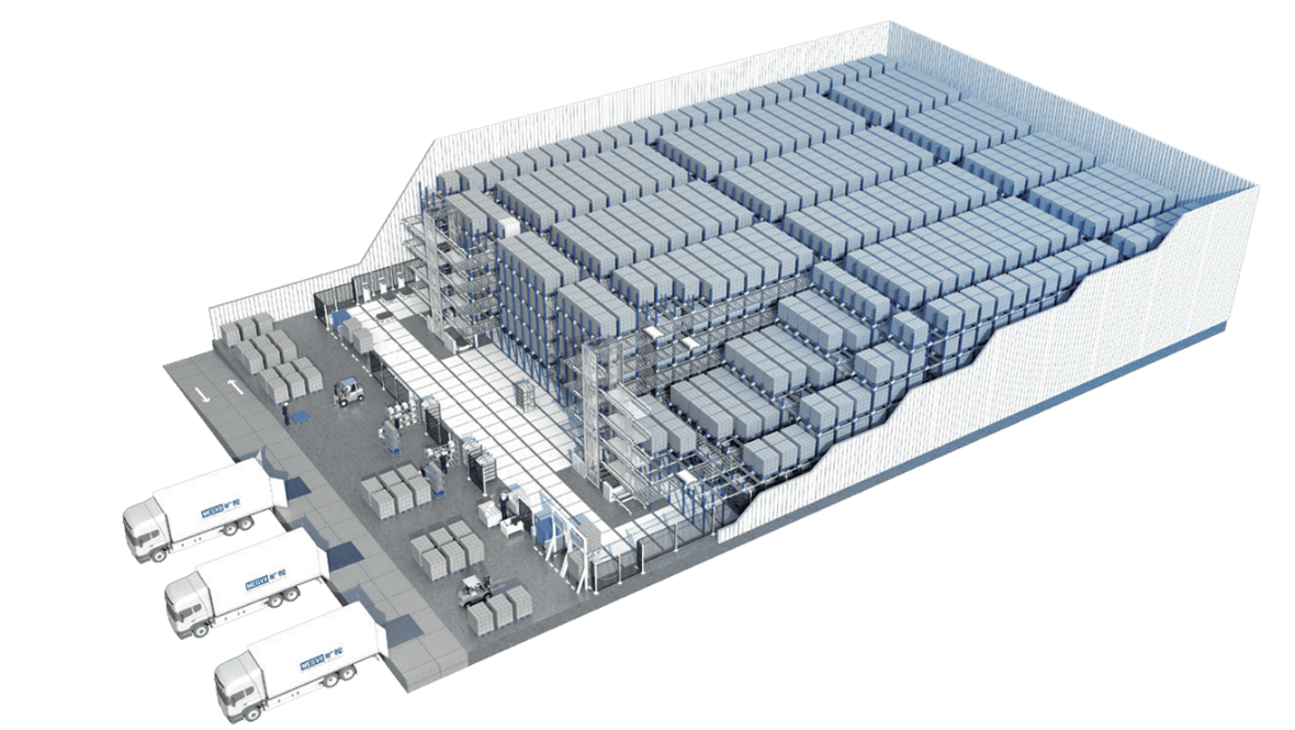 One of the most advanced Automated Storage and Retrieval Systems (ASRS). It operates with autonomous robots that move across all warehouse levels (in three dimensions), offering maximum space utilization while combining speed, reliability, and scalability. Available for all conditions (ambient, chilled, or frozen).